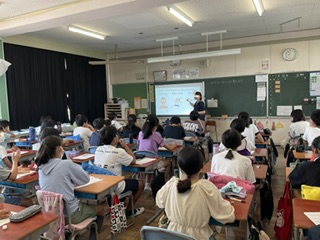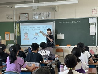 そんな暑い夏を健康に、そして元気に過ごすために、今日は学校栄養教諭が食育の観点から、熱中症予防に効果的な水分のとり方についての授業を行いました。