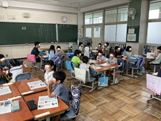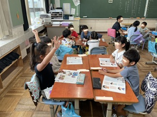 今日は、1年2組が国語の時間に「はなしたいな ききたいな」の学習で、夏休みの思い出を伝え合う授業をしていました。
