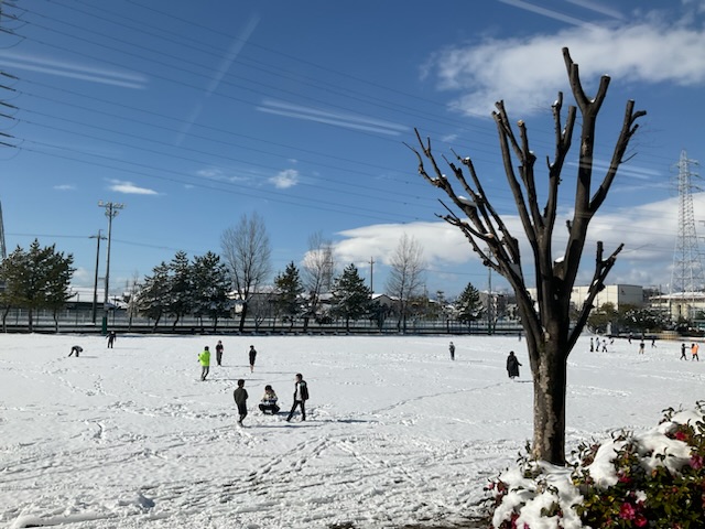 昨日の大雪で羽津北小は雪景色。子どもたちの安全を守るために今日は2時間遅れの登校となりました。