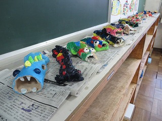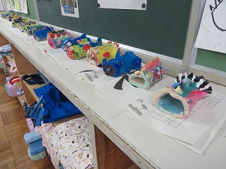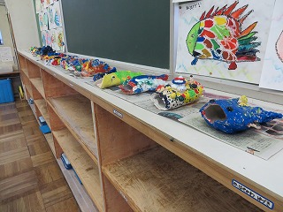 とうげいさくひんのいろぬりをしました。どのクラスもすてきなさかながいっぱいです。かくきょうしつのロッカーの上にてんじしてあります。校ないしょしゃてんを見にきてもらったついでに、ぜひごらんください。