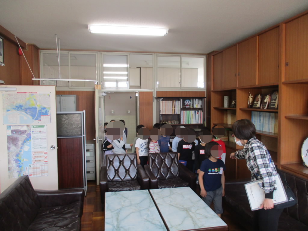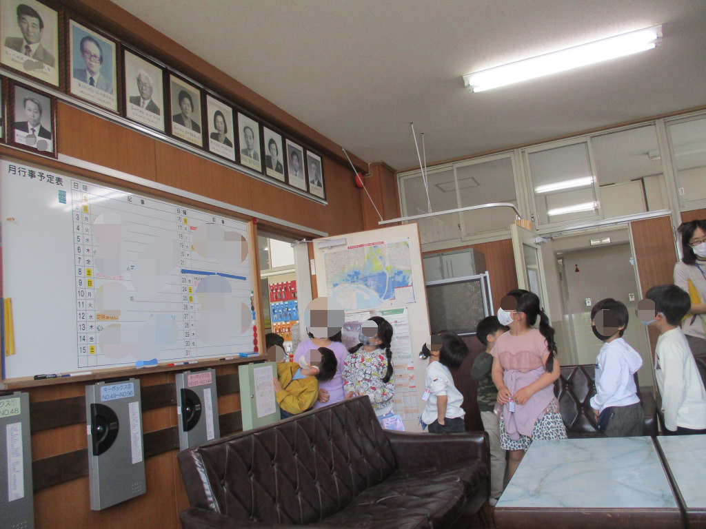 初めて入る校長室や職員室では、子どもたちは緊張しながらではありましたが、珍しいものがたくさんあって興味津々のようでした。特に、校長室では、歴代の校長先生方々の写真に興味を持っているようでした。