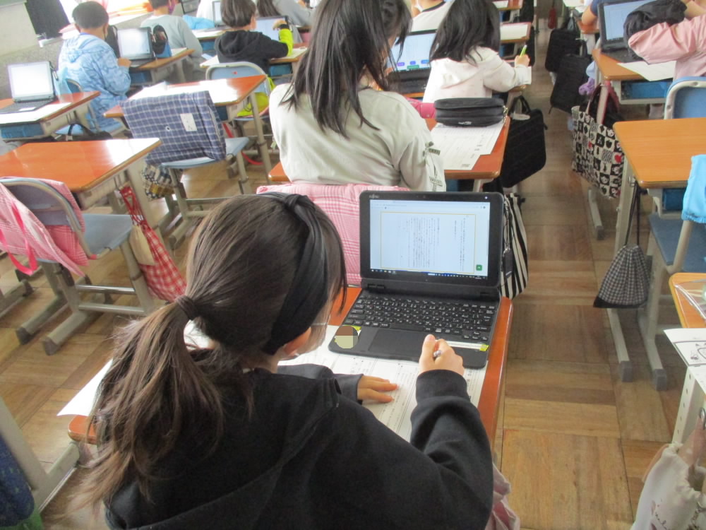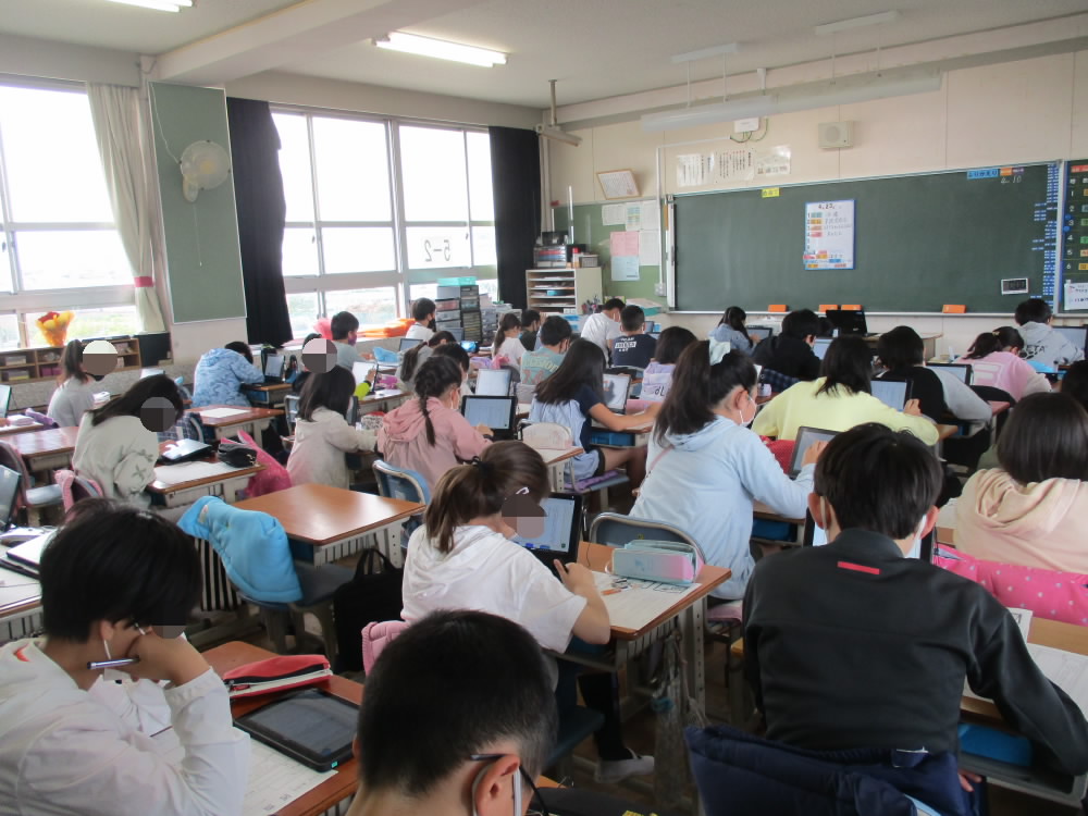 5年生の子どもたちは、慣れた手つきでタブレットを扱いながら集中した表情で問題に取り組んでいました。