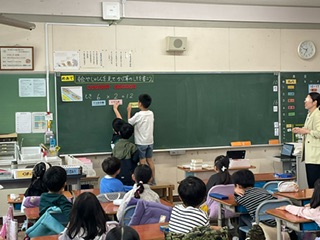 今日は2年2組で算数の授業を校内で公開し、授業研究を行いました。授業では、たくさんの先生が見に来ている中、子どもたちはいつもより一層張り切っている様子でした。また、事後の研修会では、子どもたちの主体性を育てるために適切な発問、手立てなどについて話し合いました。