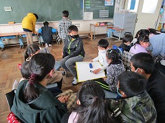 1・6年生は〇✕クイズでした。みんなで相談しながら答えを一つのホワイトボードに書き込んでいました。