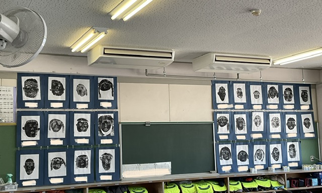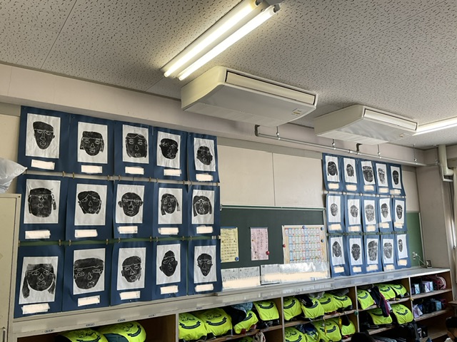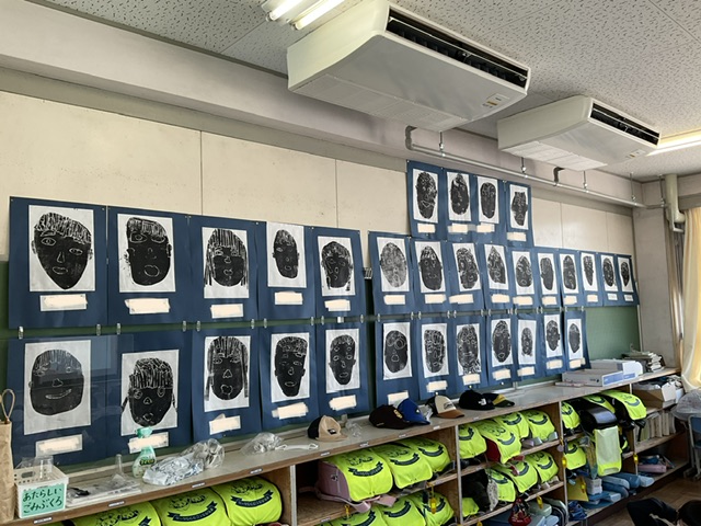 今、1年生の各教室には、先日まで1年生が頑張って作っていた紙版画が展示されています。初めての紙版画でしたが、どの作品も素敵な作品に仕上がっています。