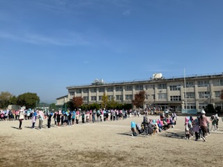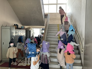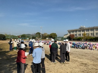 大きな地震に襲われた時の対応や、運動場に避難した後、津波警報が発令された場合の避難の仕方などを訓練しました。子どもたちは真剣な表情で訓練に取り組んでいました。