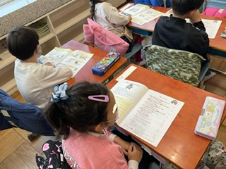 1年生は防災ノートを使って防災の授業をしていました。地震が来たらどうするか、普段からどんなことを心がけるかなどを考えました。