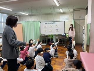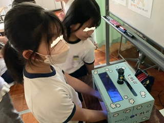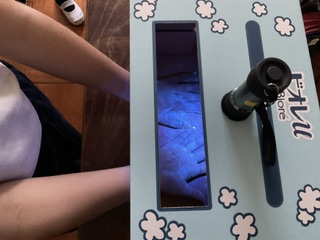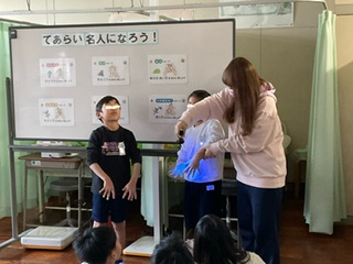 3学期が始まって、今学期も発育測定の時期になりました。発育測定の後には手洗いについての体験学習。不思議なクリームを手に塗って、しっかり手洗いをした後、光を当てると洗い残した部分が光り、自分で手洗いがきちんとできているかを確かめることができる体験をしました。