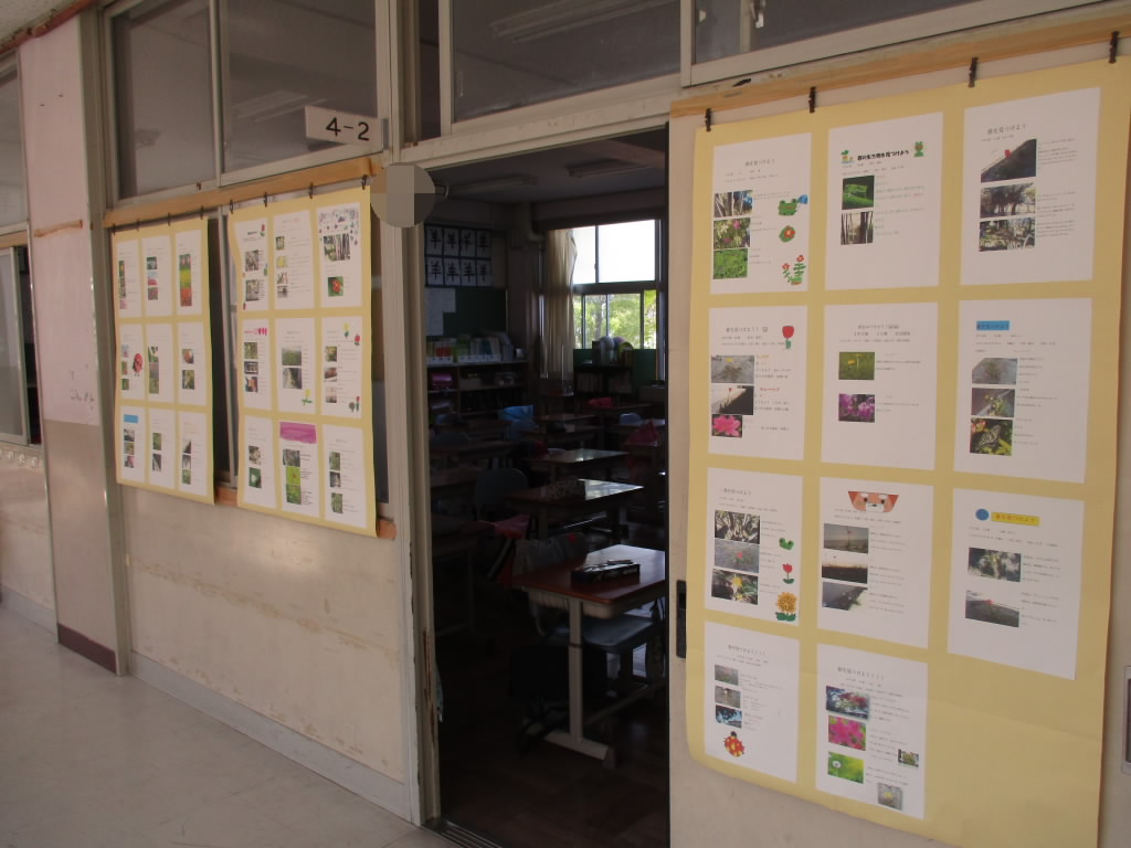 先日、こちらでも掲載した4年生の春みつけの活動で、子どもたちが作成した観察カードが4年生の教室前に掲示されています。