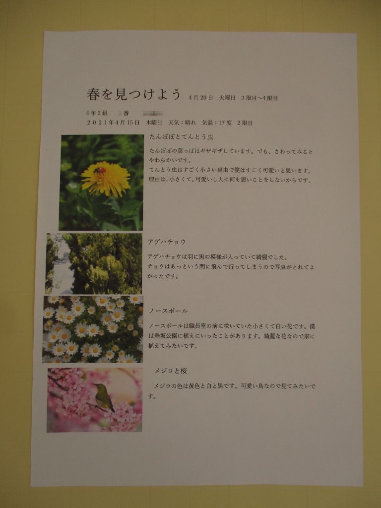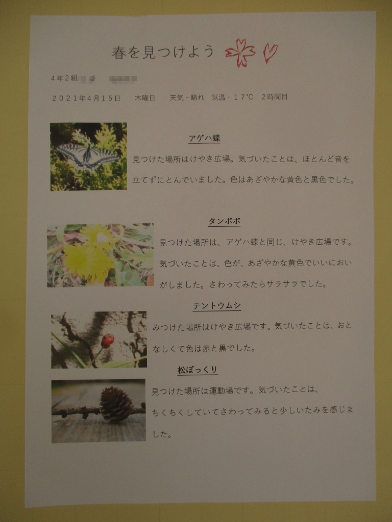 タブレットで撮影した春の生物について、タブレットを使って観察カードにまとめました。ここですべてを紹介することができないので申し訳ありませんが、一部を掲載します。目・耳・鼻・手などをフル活用して観察した様子がよく伝わってきますね。
