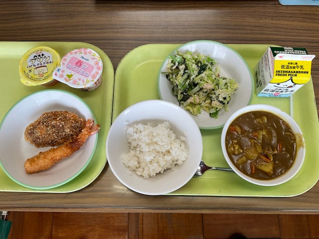 エビフライか豚ヒレカツ、すだち&桃ゼリーかプリンのセレクトでした。