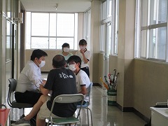 6年生の教室前廊下で、子どもたちが一人ずつジョン先生と英語で会話をする学習をしていました。(困ったときには、傍にいる先生が助け舟を出してくれていました。)