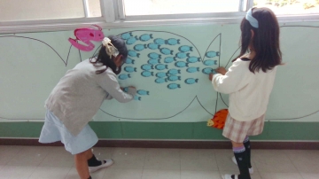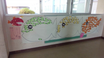 読書をしたら小さな魚の形の紙に、題名と自分の名前を書いて昇降口前に貼ります。