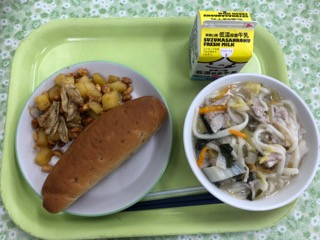 今月の献立テーマは『かみかみメニュー』です。いつものフライビーンズよりかみごたえが増えるように、「ごぼう」も入れました。たくさんかむのが苦手な児童も増えてきています。よくかんで、じょうぶな歯を育てて欲しいです。