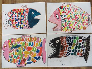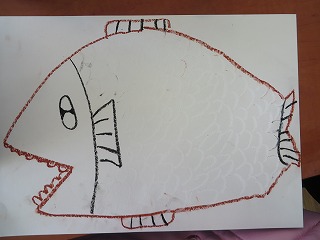 こんしゅうのずこうは「えのぐでさかなをかこう」でした。1ねん生には、すっかりおなじみとなったおさかなシリーズです。今回は、えのぐのつかいかたの学しゅうということで、クレパスで下がきをしてから、うろこをていねいにぬりました。白のクレパスでうろこをかくのがポイントで、いろをはじいてきれいに見えます。