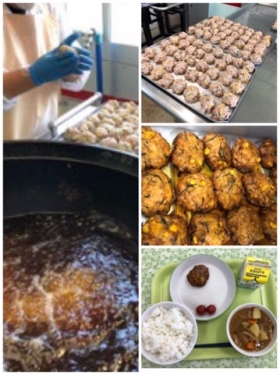 今日の給食は、調理員さんの手作り鶏つくねです。