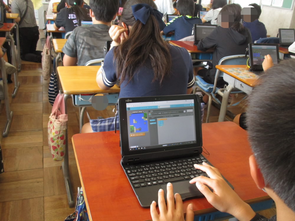 6年生は、総合的な学習の時間にタブレットを使ってプログラミングを学習していました。主に「マインクラフト」というアプリを使って、キャラクターが思い通りに動くように試行錯誤しながらプログラムを書いていきます。