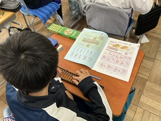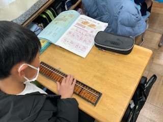 さて、3年生の教室では、算数の時間にそろばんの学習をしていました。パソコンやスマホなどの普及により電卓さえも「過去の遺物」扱いされる現代ですが、個人的にはそろばんは日本の文化としてこれからも残っていってほしいと思います。