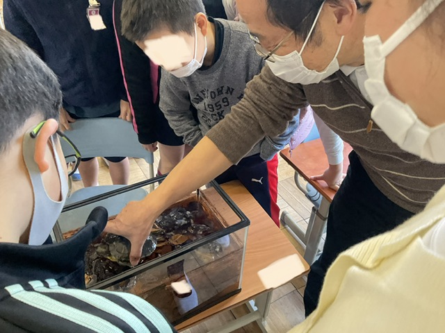そして、ひまわり学級の前を通ると、長い間冬眠していた羽津北小の可愛いペット「カメオとカメコ」の目覚めをみんなで見守っていました。まだ寒くて少し寝ぼけているのか動きが緩慢でしたが、元気に目覚めることができました。
