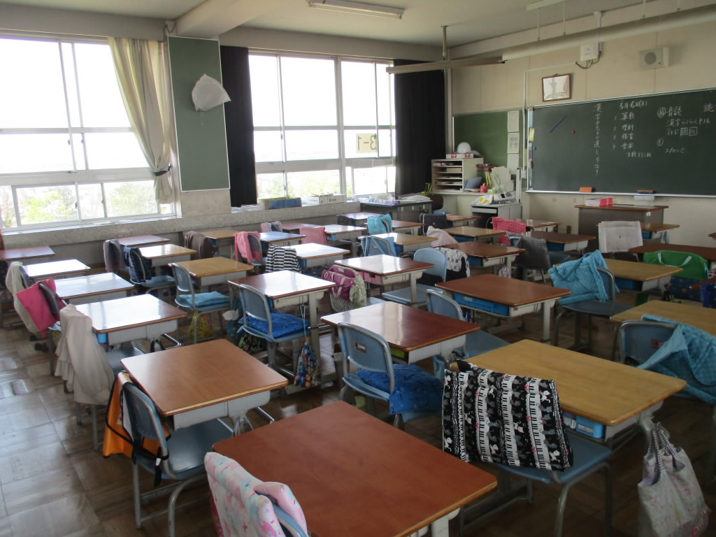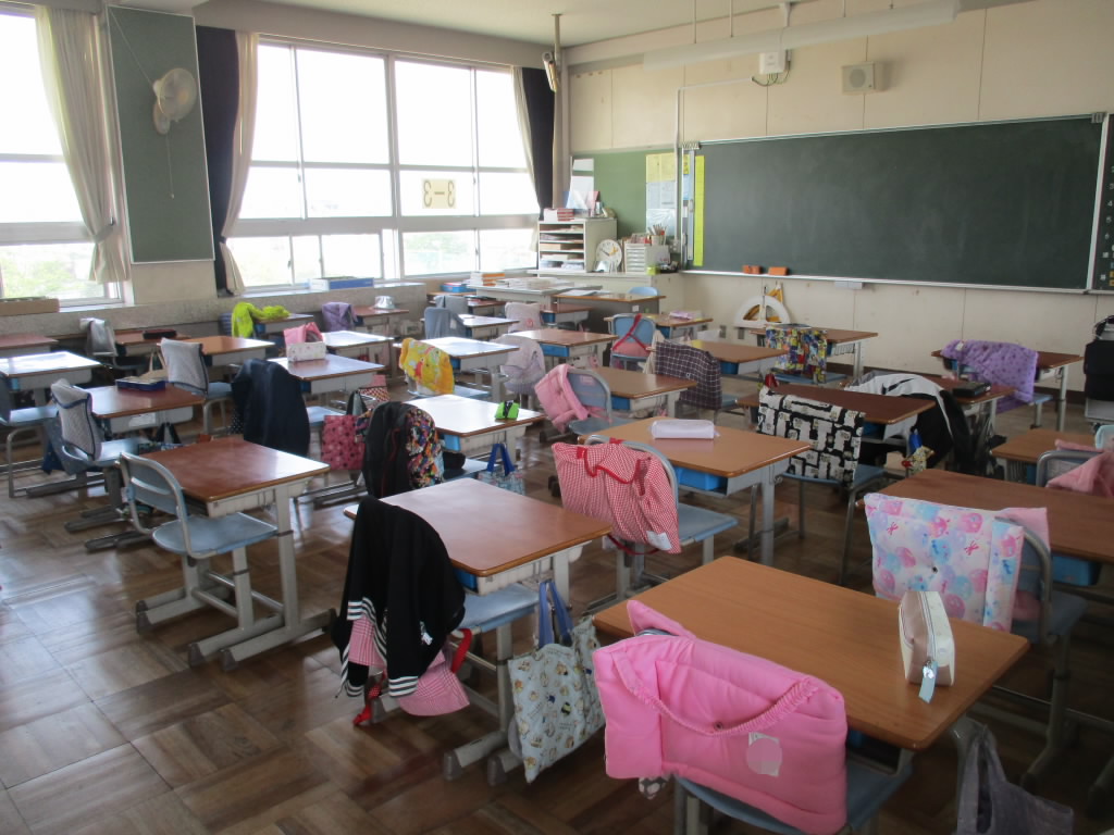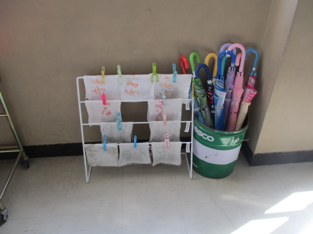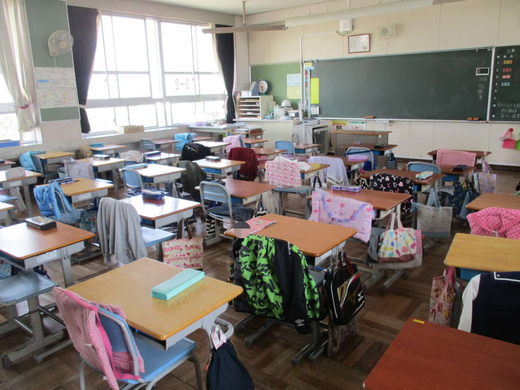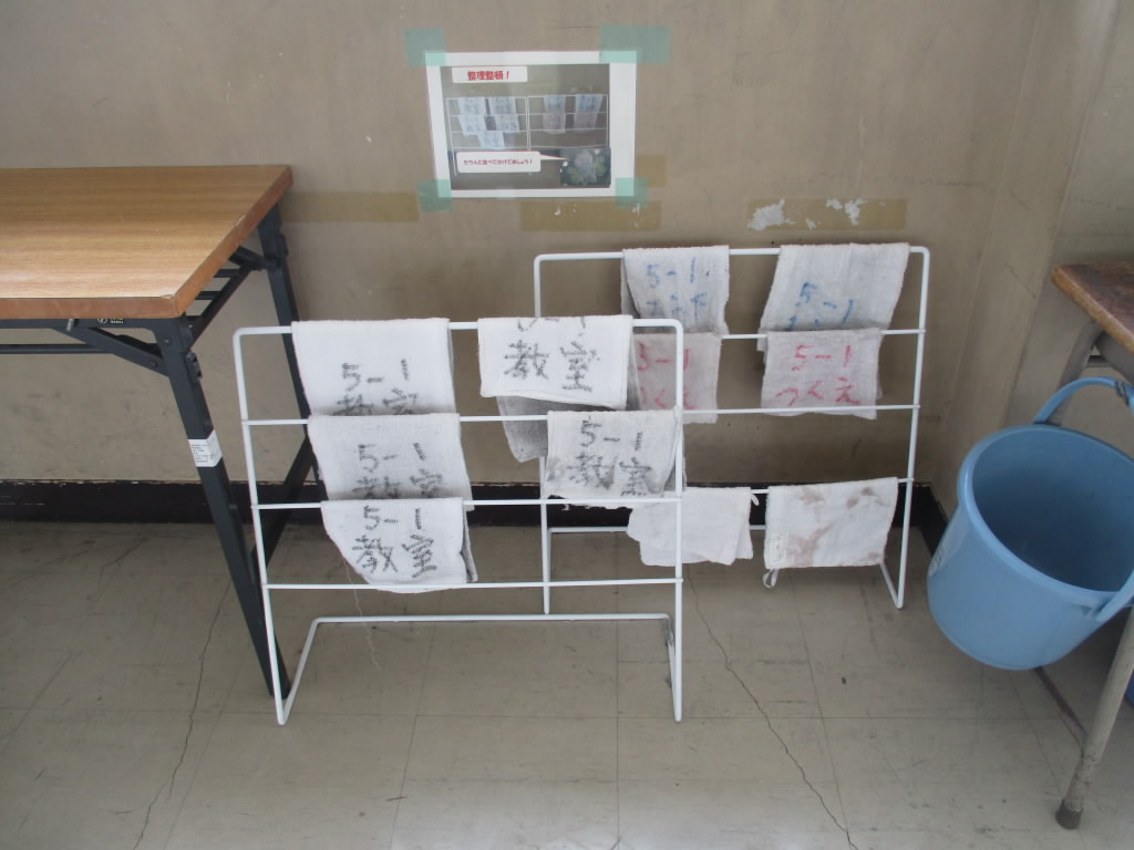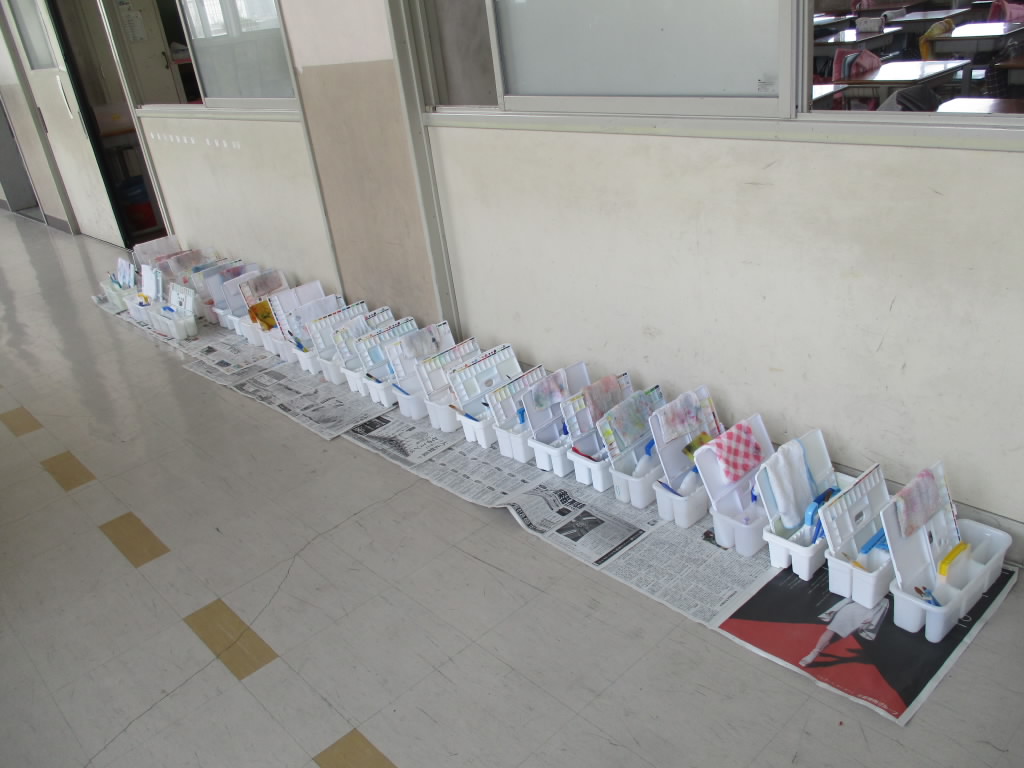 3年生が出かけた後の教室は、どの教室も椅子が机の中にしまわれていて整然とした状態でした。そして廊下に目をやると、ほかの学年の教室前でも、雑巾掛けや乾燥中の絵の具セットもきちんと整えられていました。