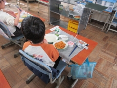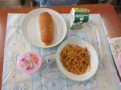 今日の献立は、コーンサラダ、ミートスパゲッティ、パン、おいわいゼリー、牛乳でした。 「おいしいね」「もっと食べたいな」と笑顔で、友だちと一緒に食べる給食の時間を楽しんでいました。