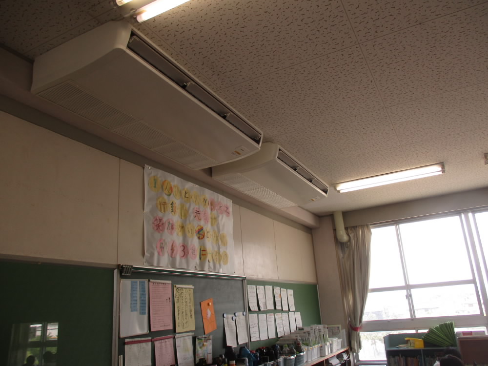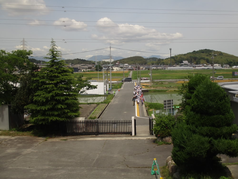 そんな暑い中ですが、今日は2年生の子どもたちが、いかるが方面に町探検に出かけました。熱中症対策もあって予定よりも少し早めに帰って来ました。また、学校の中では、1年生の体育は直射日光があたらない体育館で窓や扉を開放してかけっこをしました。そして、各教室では、エアコンが活躍し始めました。