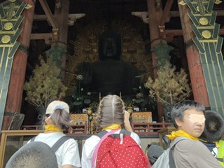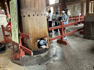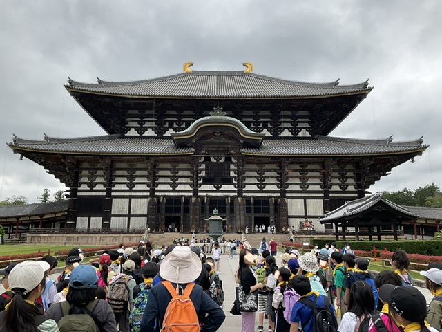 まずは、東大寺大仏殿を見学。大仏殿の大きさに驚きながら、興味深く見学していました。コロナ禍でできなかった鼻の穴くぐりも復活していて、たくさんの子どもたちがチャレンジしていました。