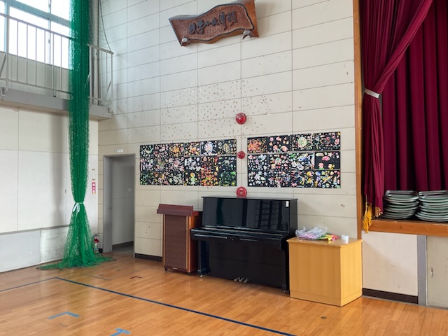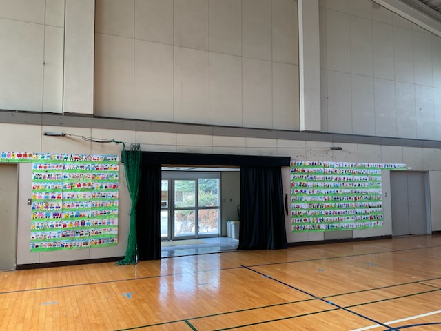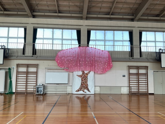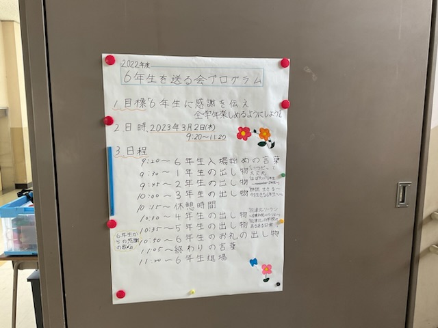 。児童の作品や大きな桜の木で飾り付けられた会場、中央階段付近に掲示されたプログラムなどを見ていると、当日が待ち遠しくなる反面、6年生とのお別れの日が近づいてきて少し寂しさも感じます。