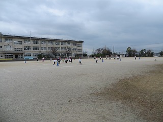 そつぎょうしきのれんしゅうでたいいくいかんがつかえないので、3クラスともそとに出ています。2クラスがボールけり、1クラスが、ゆうぐあそびやてつぼうをしています。ボールけりは、しあいけいしきとなり、どのクラスもはくねつしています。
