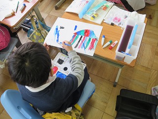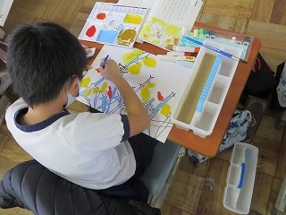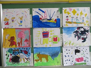 ずこうのさいごは、「おはなしのえ」です。こくごのきょうかしょを見て、いちばんこころにのこっているばめんをかきました。いちばんにんきは、やはり「スイミー」でした。えのぐをつかうのもこれでさいごです。これから、えのぐセットをはじめいろいろなものをもちかえります。2年生がはじまるまでに、なかみのせいとん、ほじゅうをしておいてくださいね。
