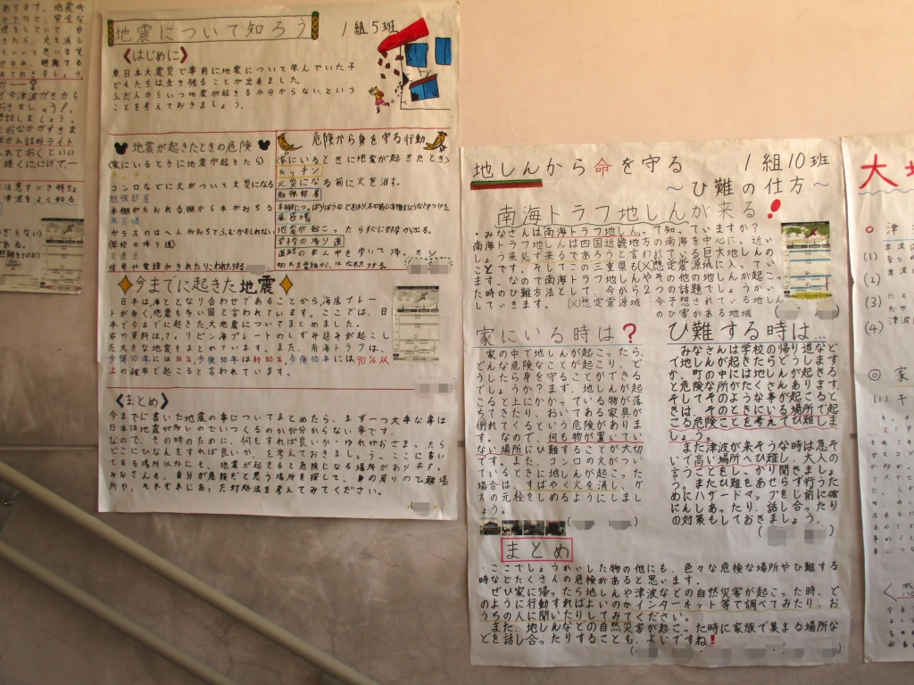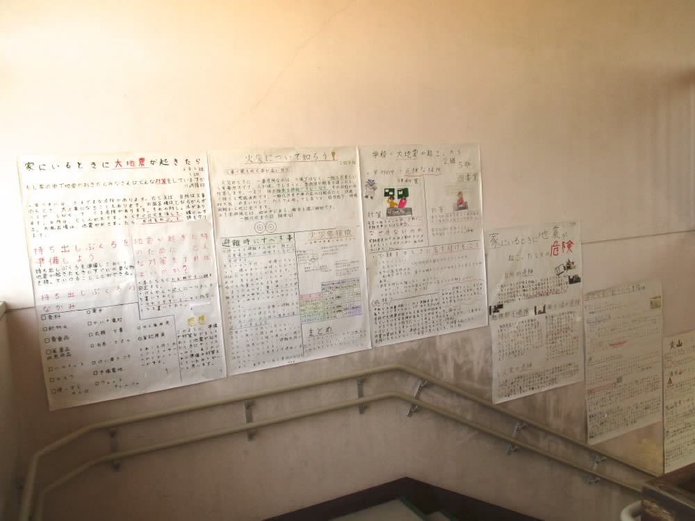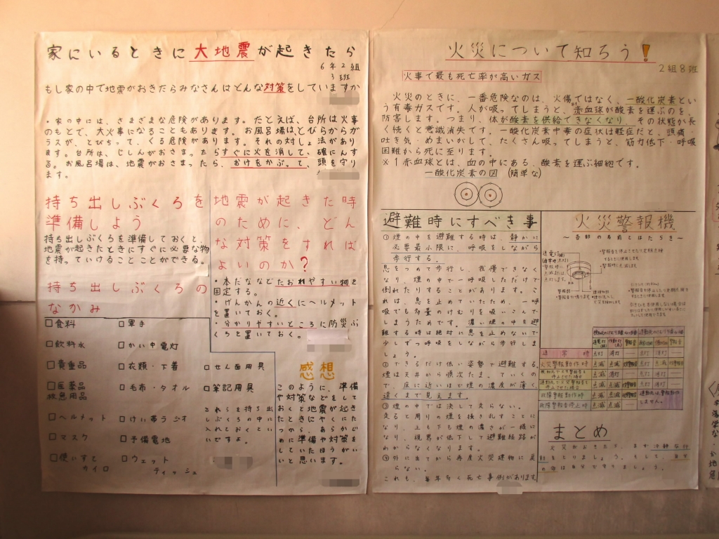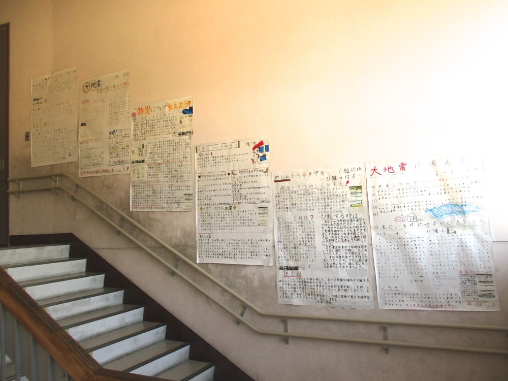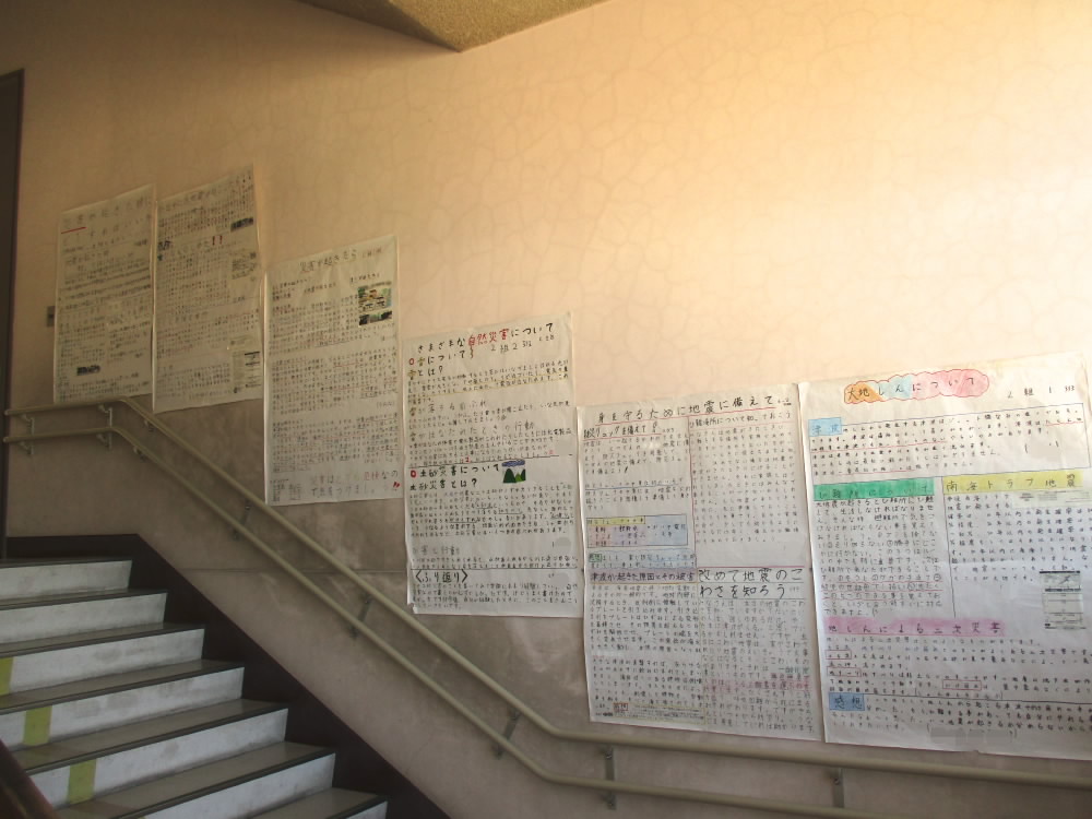 先日から東階段に6年生が作成した防災新聞が掲示されています。地震や火事など様々な災害に対してどんな準備が必要なのか、また、実際に起きた時にどうすればいいのかなどを自分たちの考えや感想などを含めて作られています。その中のいくつかをこちらで紹介させていただきます。