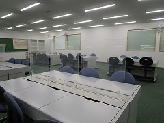 〇パソコン室の写真です。向かい合う机の間にシールドを設置しました。