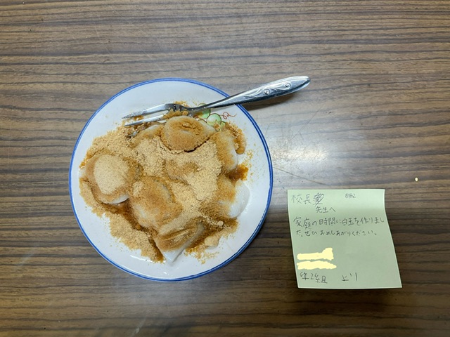 今日は午前中、会議のために出張に出掛けていたのですが、お昼過ぎに学校に戻ると校長室の机上に素敵なプレゼントが置いてありました。6年生が家庭科で作った白玉だんごです!食べてみるととっても美味しくて、午前中の会議で使った脳に復活のエネルギーを与えてくれました。甘いもの好きの私には最高のプレゼントでした。6年2組の子どもたち、ありがとう!