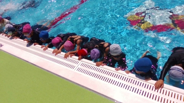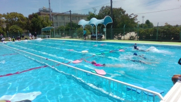 プール内のそれぞれのビート版まで泳ぎ、とって戻ったら次の子にタッチ。
