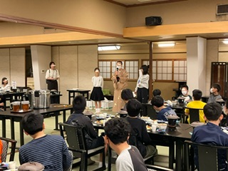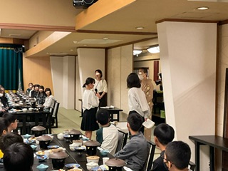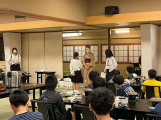 夕食前に入館式を行い、代表児童から女将さんに挨拶しました。