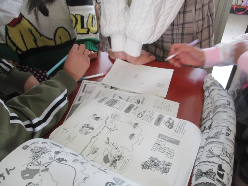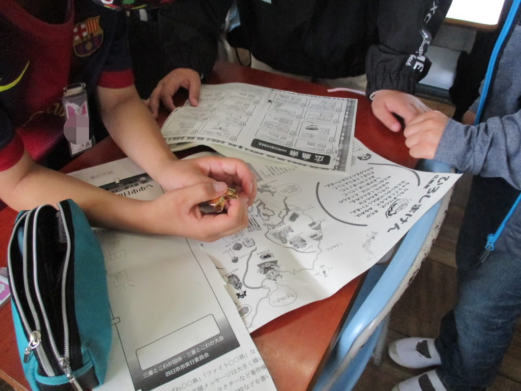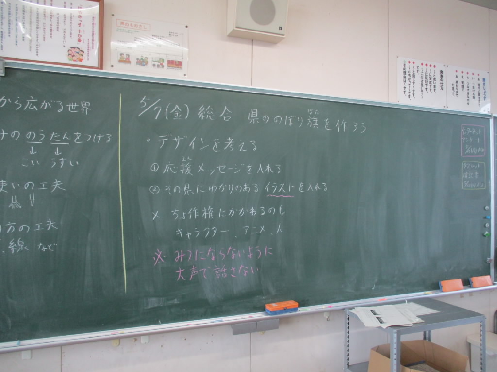 さて、6年生は1時間目の総合的な学習の時間に、今年開催される「三重とこわか国体」にむけて、各県を応援するのぼり旗のデザインを考えていました。自分たちで応援したい都道府県を選んで、それぞれの特産物や工芸品などを調べながら考えていました。