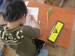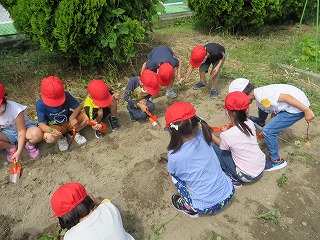 こんしゅうは、じかんわりをへんこうして、あめがふるまえにさつまいものなえをうえました。うえるまえにひとり1ぽんずつてにとりかんさつをしました。あきにおいしいおいもができるようみんなでそだてていきましょう。