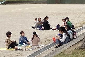 グループでペアになり、給食をお弁当箱に詰めて一緒に食べました。