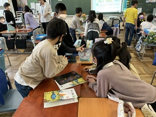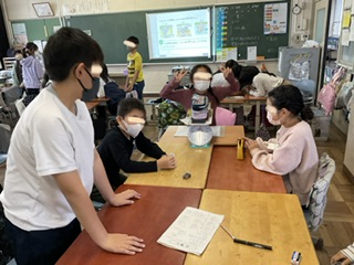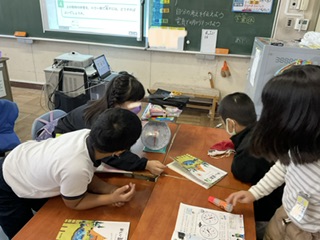 1時間目に3年生の教室から、子どもたちの元気な声が聞こえてきたので、教室を覗きにいくと、はかりを使っていろいろな物の重さを測る活動をしていました。自分たちの文房具などを使って、1キログラムピッタリを作るという活動です。写真のように1キログラムピッタリに成功したグループからは歓喜の声。遊びの要素を取り入れながら量感を学ぶという楽しい授業でした。