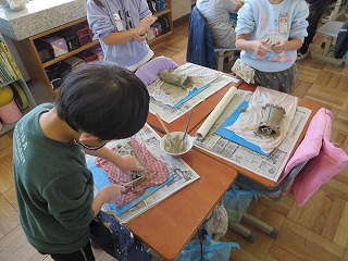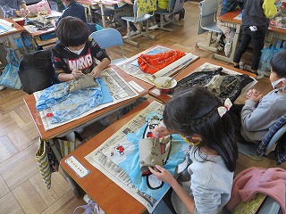 こんしゅうのずこうは、とうげいかつどうのほんばんです。いつもとちがうねん土の手ざわりに、とまどうすがたもみられましたが、すぐにじぶんのおもいどおりにつくることができました。手ぬぐいとうのよういをしていただきありがとうございました。しっかりかわかしてから、すやきをしていろをつけてかんせいのよていです。