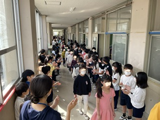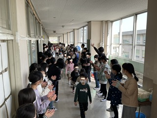 今日は、1年生を迎えるイベント「1年生歓迎ロード」を実施しました。新1年生は少し緊張気味でしたが、在校生、教職員のみんなで「ようこそ羽津北小へ!」「入学おめでとう!」と声をかけながらみんなで入学をお祝いしました。