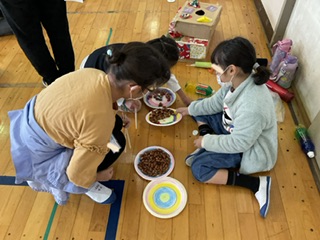 以前にゆめくじら公園で集めてきたどんぐりを上手に使ったゲームでお店を開き、子どもたち同士でお店屋さん、お客さんを交代しながら楽しい時間を過ごしました。