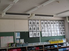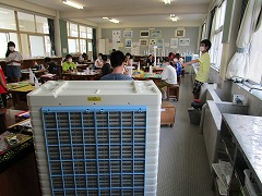 また、特別教室(図工室・理科室)にはエアコンが入っていませんので、日本総合施設様からご寄付いただいた冷風扇を設置して少しでも涼しいようにと工夫しています。