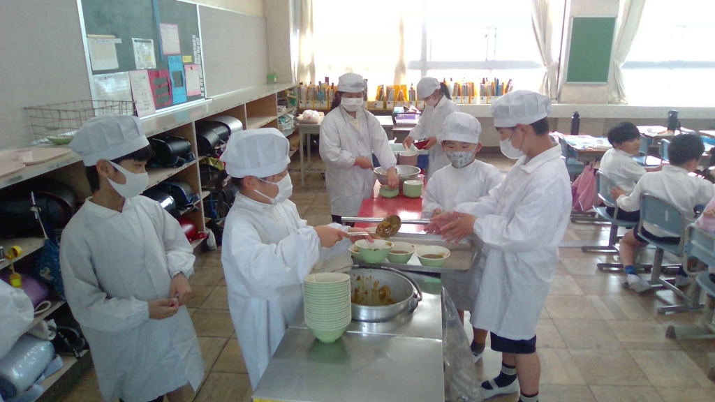 2年生以上は、新しいクラスでの給食当番活動を、役割分担しながら協同作業。素早く衛生に気を付けながら頑張っています。