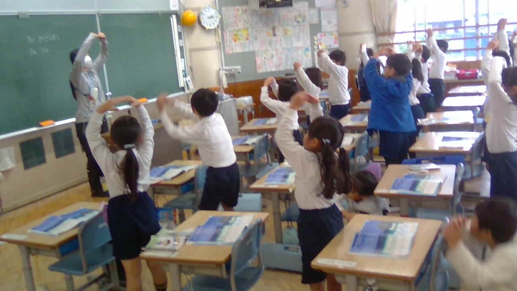 1年生、5限目は3クラスが同時に各教室で音楽。