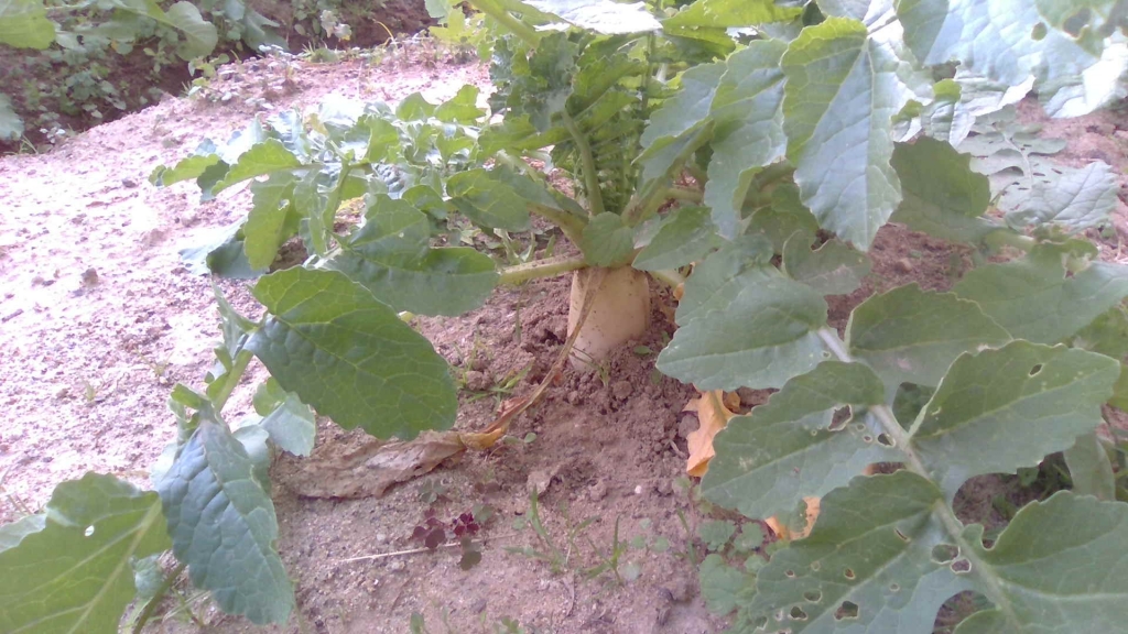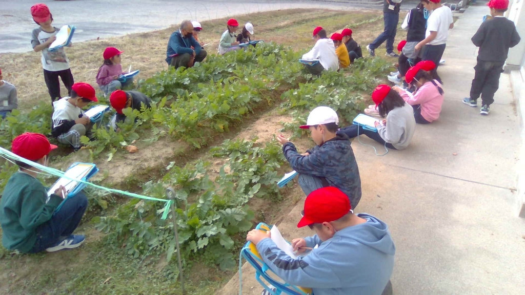 気づいたことをつぶやきながら、記録していく2年生。立派な大根が育っています。
