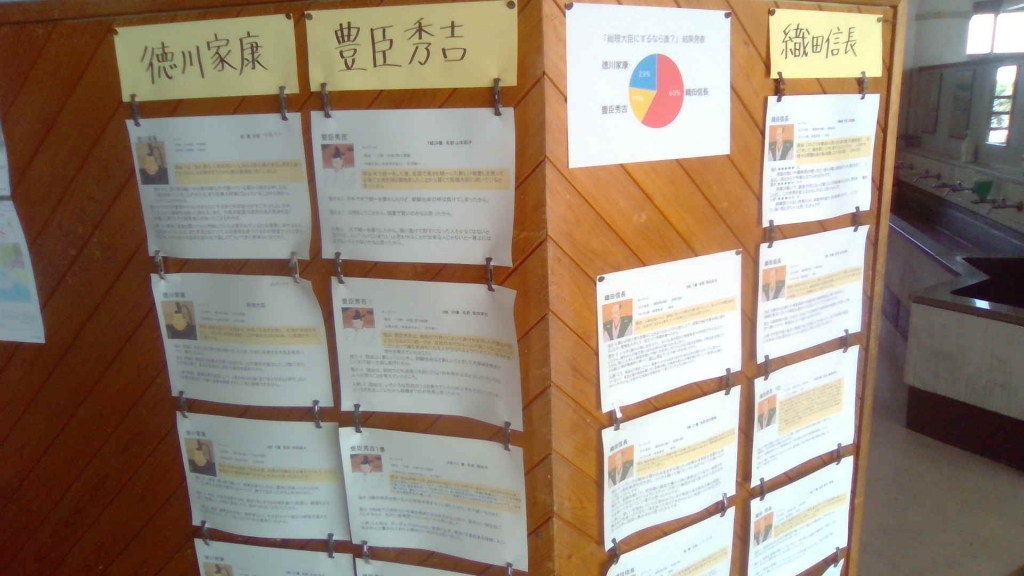 6年生社会、発展学習として「戦国三英傑、信長、秀吉、家康の中で、もしも総理大臣にするなら誰?」が出されていました。。