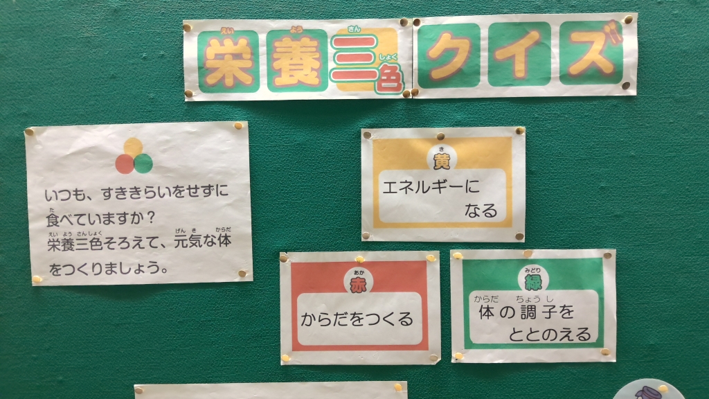 体育館通路掲示板には、食育に関する掲示を、季節等に応じて栄養教諭が行っています。今は、栄養素についてのクイズが出されています。