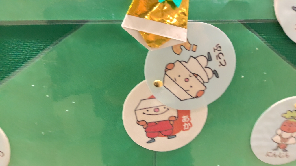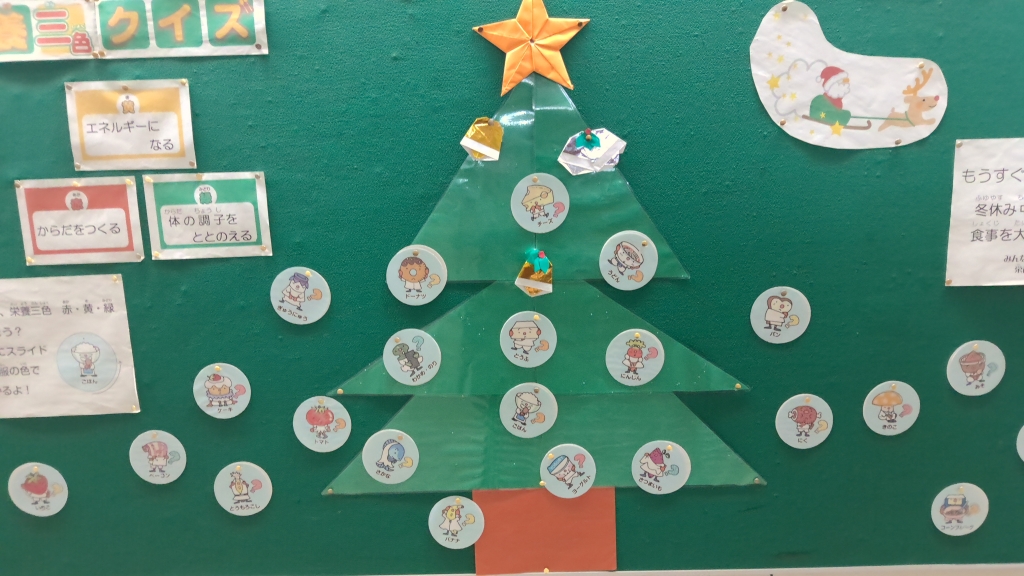 問題の隣には、クリスマスツリーを形どり、飾りとして様々な食べ物の名前が張られています。