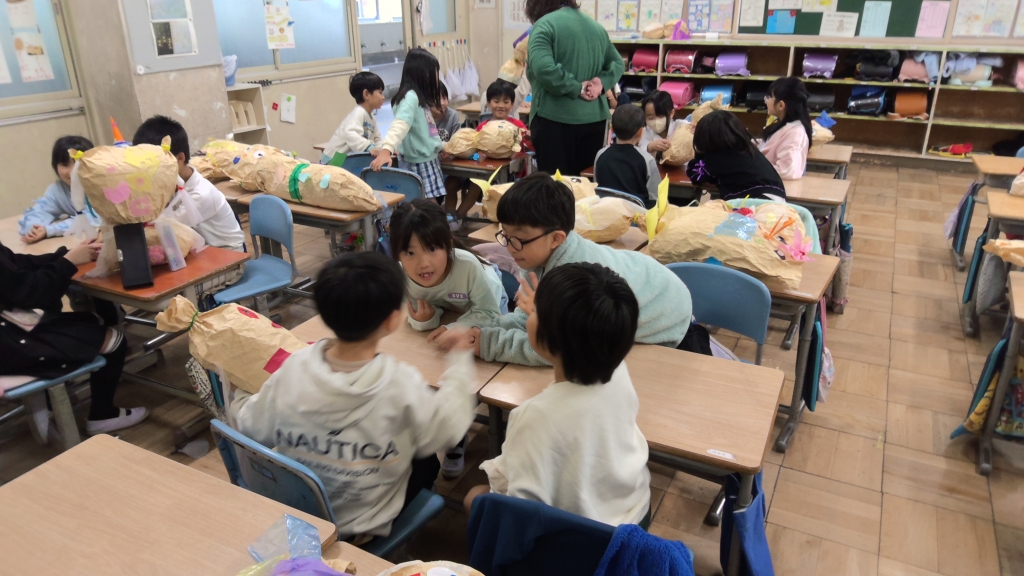 2年生図工、紙工作で大きめのぬいぐるみサイズの「ぎゅっとしたい友だち」を完成させた2年生。今日は、その「友だち」をクラスの「友だち」に紹介する時間です。